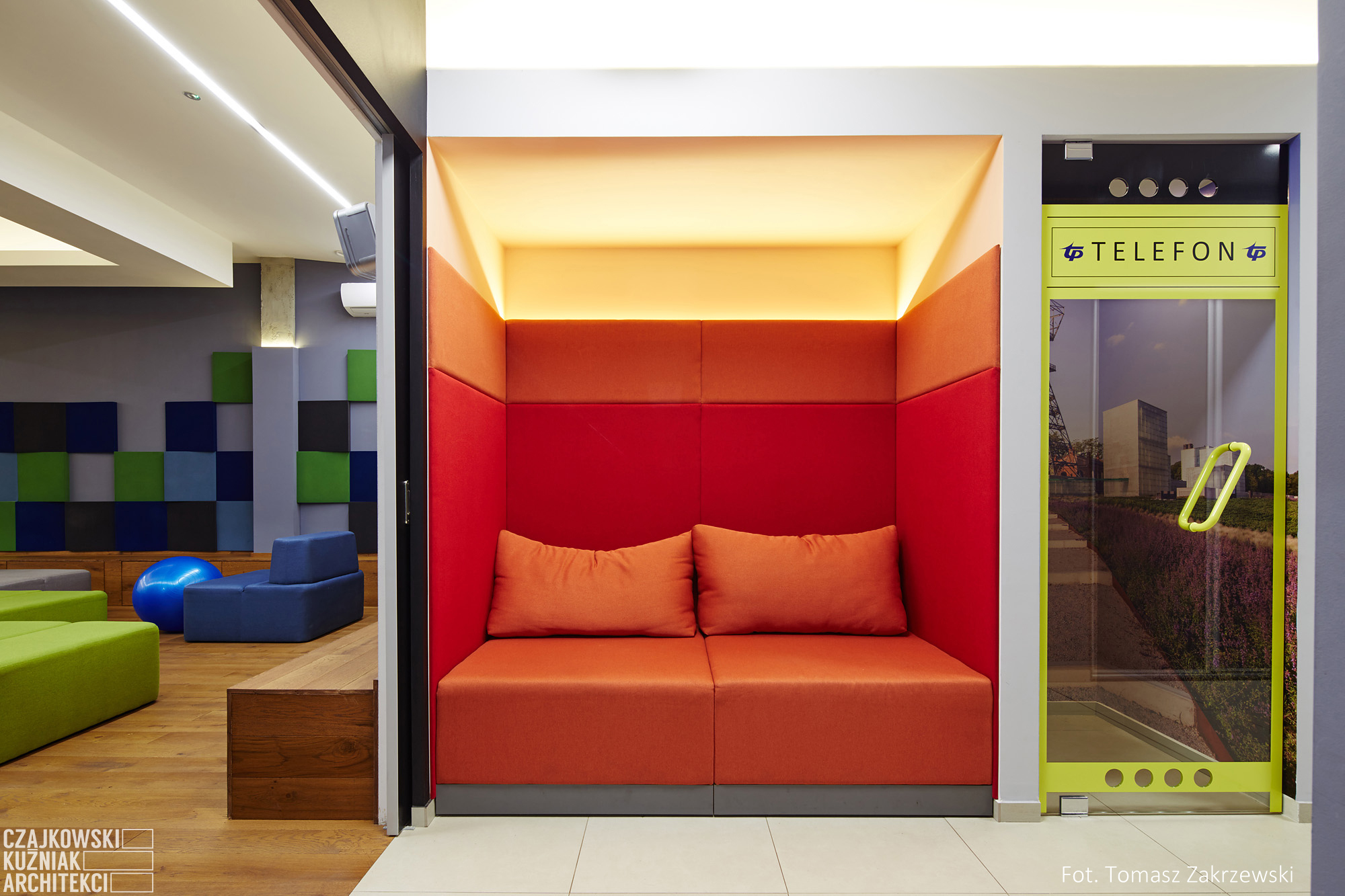 Dając im funkcjonalną przestrzeń w niebanalnych kolorach, z miejscami, w których mogą się schować i gdzie mogą się odciąć: salkami konferencyjnymi, budką telefoniczną, wielką salą z pufami, na których można rozciągnąć plecy, czy ogromnymi sofami we wnękach korytarza. Ze względu na ilość osób pracujących pod jednym dachem, postaraliśmy się o dwie w pełni wyposażone kuchnie oraz jadalnię, na ścianach której widnieją szalone graffiti.