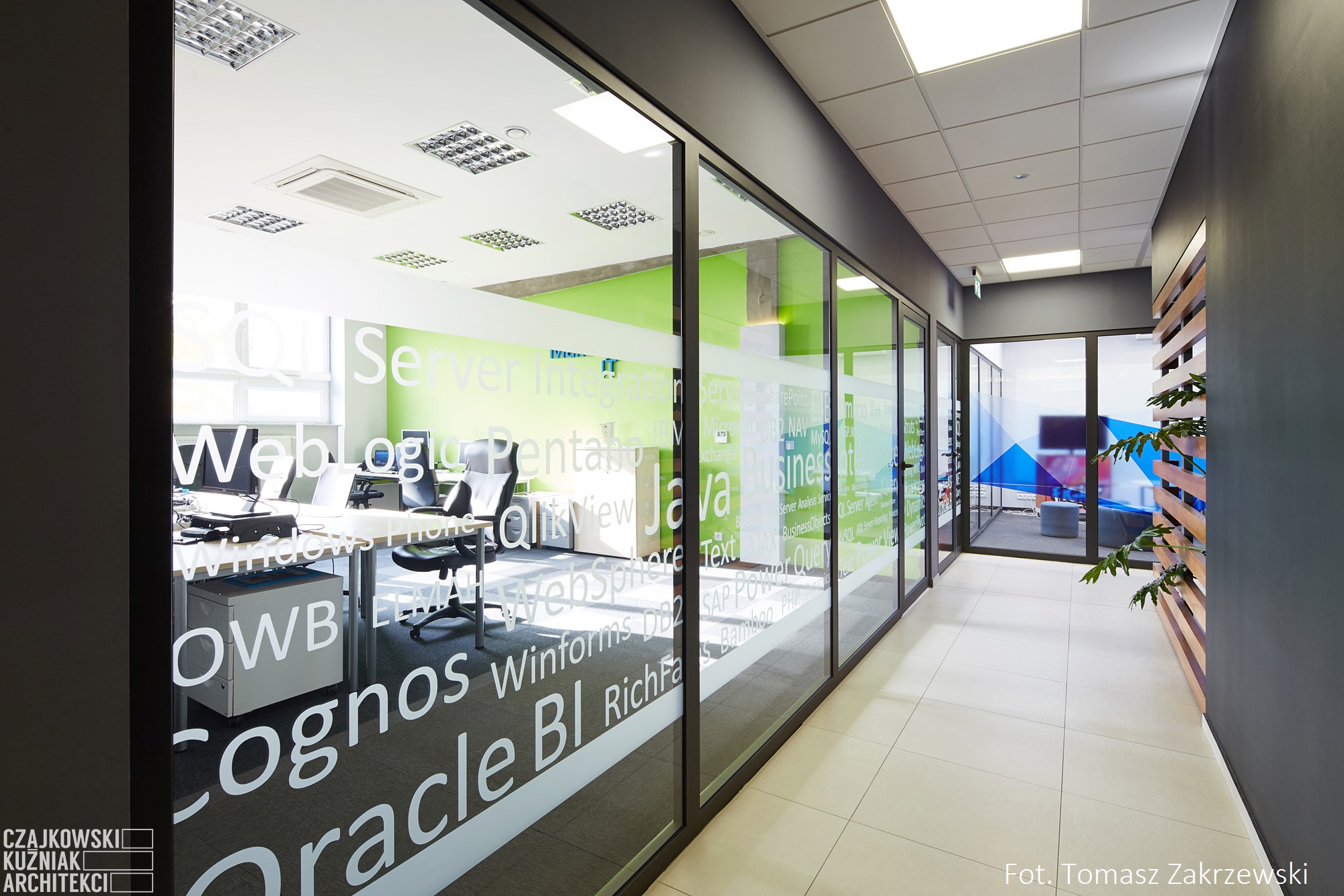 Dwiema kwestiami – potrzebami pracowników oraz możliwościami, jakie dawał nam budynek, w którym znajduje się nasza siedziba główna. Ponieważ mamy wiele zespołów, pracujących w różnych technologiach i nad różnymi projektami, open space nie wydawał nam się odpowiednim rozwiązaniem. Z jednej strony chcieliśmy zapewnić naszym ludziom komfort pracy, a z drugiej nie chcieliśmy stawiać między nimi ścian. Rozwiązaniem okazały się szyby oklejone stosownie do danej technologii, które są dosłownie oknem na biurowe życie.