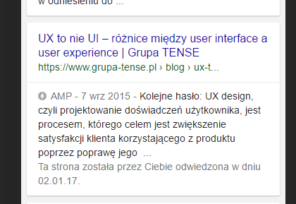 Użytkownicy wersji responsywnych szczególną uwagę powinni zwrócić na szybkość ładowania się strony. Pamiętajmy, że łącza w urządzeniach mobilnych często są wolniejsze niż szerokopasmowe łącza w urządzeniach desktopowych. Choć szybkość ładowania się strony nadal nie jest jednym z czynników rankingowych, Google dąży do tego, aby była jednym z nich. Dbając o wygodę użytkownika, warto ten czynnik zoptymalizować. W tym przypadku alternatywnym rozwiązaniem może być wdrożenie w serwisie rozwiązania AMP (Accelerated Mobile Pages) wspieranego przez Google. Technologia ta pozwala na błyskawiczne przejście na stronę z mobilnych wyników wyszukiwania. Spowodowane to jest ładowaniem się strony bezpośrednio z serwera Google dzięki odpowiedniemu sformatowaniu kodu, który pobierany jest wcześniej przez robota. Wyniki AMP są dodatkowo oznaczane w SERP-ach przez symbol błyskawicy.