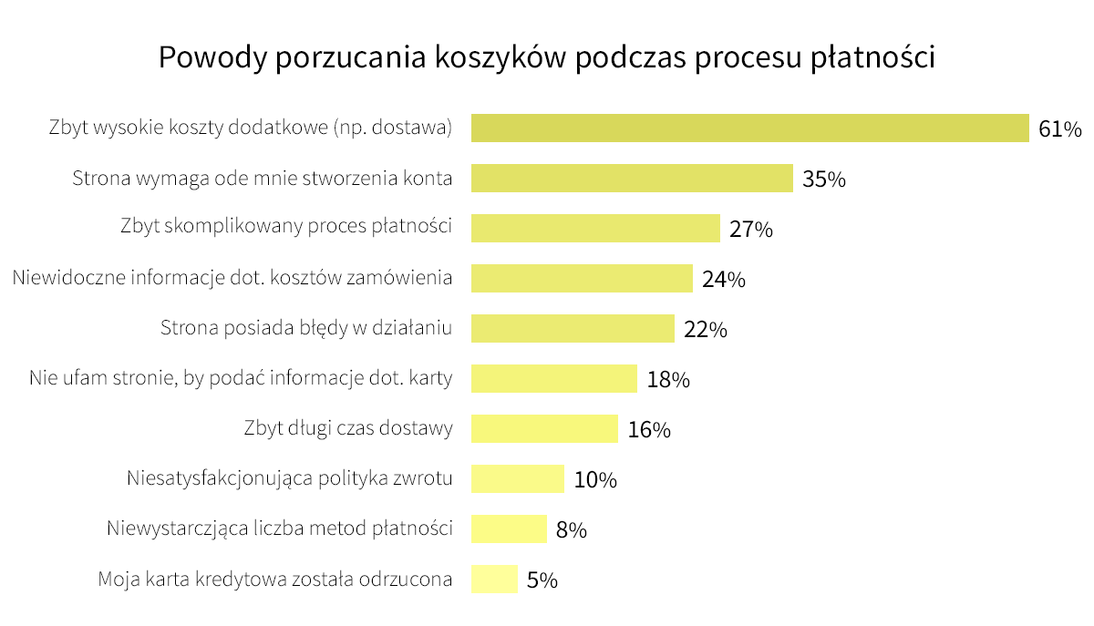 Oczywiście to nie wszystkie powody porzuconych koszyków. Nie na każdy mamy wpływ – np. na odrzucenie transakcji z powodu błędu karty lub awarii po stronie banku, czy niedostatecznych środków na koncie klienta. Jednak to, co leży po naszej stronie, to na przykład zaproponowanie kilku form płatności. Klient lubi mieć wybór, więc nawet jeśli w statystykach wychodzi nam, że klasycznego przelewu bankowego dokonuje niewielki procent naszych klientów, to zostawmy tę opcję dostępną. Nie wszyscy czują się pewnie, podając dane z karty kredytowej, szczególnie kiedy dokonują zakupu na tej stronie po raz pierwszy, więc nie czyńmy z tej formy płatności jedynej dostępnej.