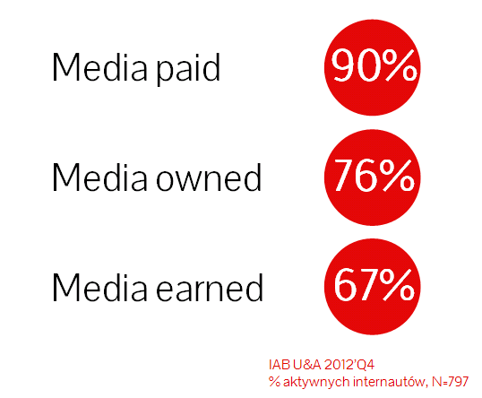Kolejne pod względem ważności są tzw. „media owned”, czyli wszelkie kanały kontrolowane przez markę, takie jak strona www, profil marki w serwisie społecznościowym, mobilna wersja serwisu, aplikacja, sklep internetowy, wirtualny katalog itp. Wymienia je przeszło trzy czwarte badanych (76%). Każda z tych platform służy tworzeniu unikalnego „brand experience”. Ważne jest jednak, żeby do obecności marki w każdym z kanałów podchodzić indywidualnie, biorąc pod uwagę ich specyfikę ze względu na przyzwyczajenia i oczekiwania internautów, wynikające z kontekstu użycia danej platformy – podkreśla Magdalena Kurylak, strategic planner GoldenSubmarine.