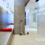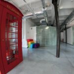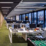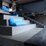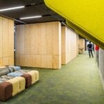 Najważniejszym miejscem w tej siedzibie jest recepcja z video wall’em i usytuowany na jej tyłach amfiteatr, który powstał po wyburzeniu dziury pomiędzy dwoma piętrami budynku. Przestrzeń amfiteatru daje możliwość spotkania się w jednym miejscu wszystkim 300 osobom, zatrudnionym w Grupie K2. To idealne miejsce do organizacji spotkań, konferencji, prezentacji, czy pokazów filmowych. Tu można usiąść wygodnie na poduchach by zjeść kanapkę, spotkać się na status, czy popracować w małej grupie. Przestrzeń ta stanowi jednocześnie ciąg komunikacyjny między piętrami. A po siedzibie K2 najlepiej poruszać się na hulajnogach. 😉