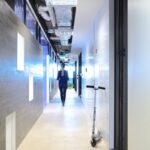 Droga do stanowisk pracy wiedzie z parteru przez bramki dostępu prowadzące do klatki schodowej i 5 dużych wind, które uniosą jednocześnie 65 osób. Wysiadając na jednej z sześciu kondygnacji znajdujemy się na korytarzu zdominowanym z jednej strony przez monochromatyczną szarość ścian, a z drugiej – przez jasne sosnowe panele. Podążając tym ciągiem mijamy kolejne biura i przestrzenie relaksu. W chwilach wytchnienia można posiedzieć tam na specjalnie zaprojektowanych dla Pixela pufach, pograć w piłkarzyki, rozruszać kości na rozstawionym tu i ówdzie sprzęcie gimnastycznym. Zwolennicy jogi mogą wyciszyć się w trzech specjalnych namiotach na piątym piętrze.