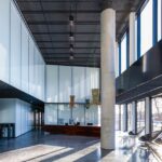 Główne wejście do budynku zlokalizowane jest od strony ul. Grunwaldzkiej. Hol jest jasny i przestronny, dominuje w nim ogromne, drewniany mebel będący biurkiem recepcyjnym. Nad nim wiszą trzy ogromne, nietypowe lampy (firmy Foscarini, z serii – nomen omen – Allegro). Na lewo – bramki i wejścia do wind. Zanim jednak udamy się na wyższe piętra – warto dokładnie zwiedzić parter, bo dużo tu się dzieje.