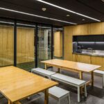Nieformalnym miejscem spotkań są też kuchnie. Na jednym piętrze znajdują się zwykle cztery kuchnie z jadalniami, w których z powodzeniem znajdzie się miejsce na pączkową imprezę czy obiad całego działu. Kuchnie zostały tak przygotowane, by można było swobodnie łączyć przestrzenie dwóch pomieszczeń i tworzyć jedną ogromną salę. To wszystko dzięki mobilnym ściankom działowym. I tu ciekawostka – panele dzielące pomieszczenia pokrywa specjalna farba, po której można pisać mazakami. Działają jak zmywalna biała tablica, więc i strategię pracy łatwo da się tutaj omówić.