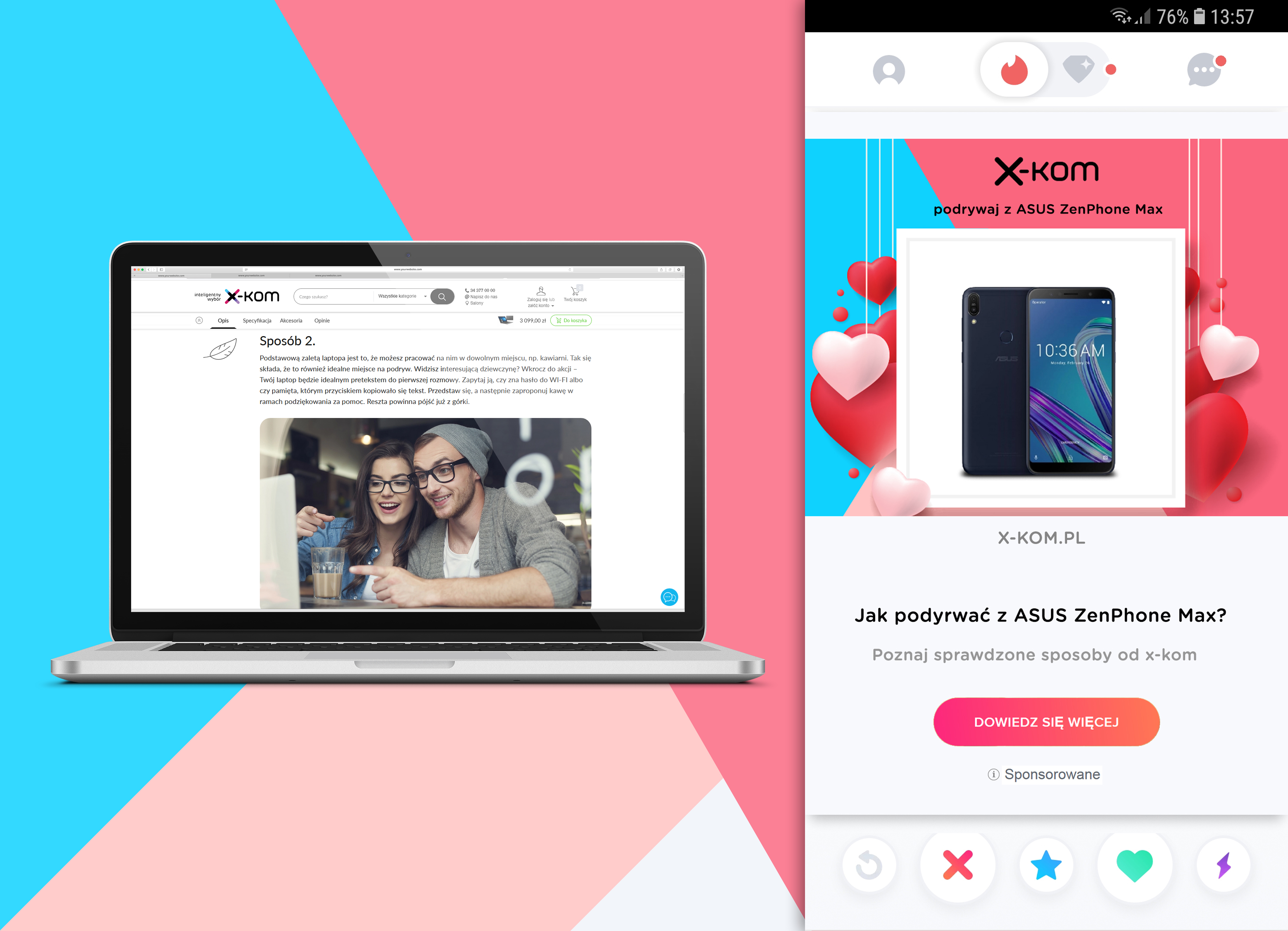 Z okazji walentynek x-kom zdecydował się pomóc osobom wciąż poszukującym swojej drugiej połówki. Aby dotrzeć do singli, wykorzystano najpopularniejszą w tej chwili aplikację randkową – Tindera. Polscy użytkownicy pomiędzy profilami potencjalnych parterów znaleźć mogą propozycję produktów dostępnych w sklepie wraz z paczką „sposobów” jak wykorzystać je do udanego podrywu.
