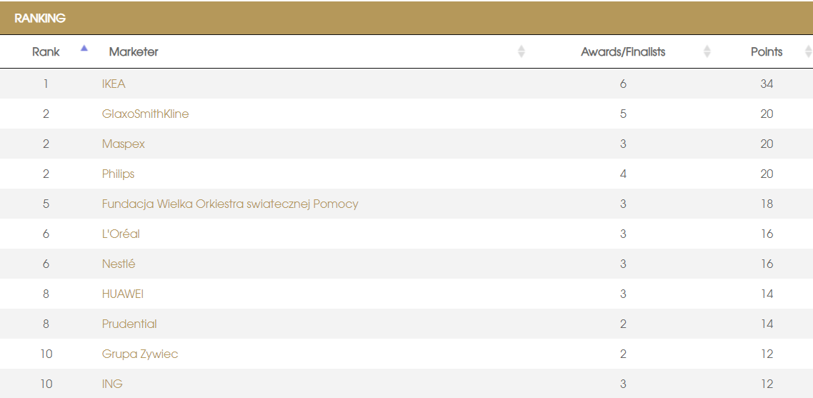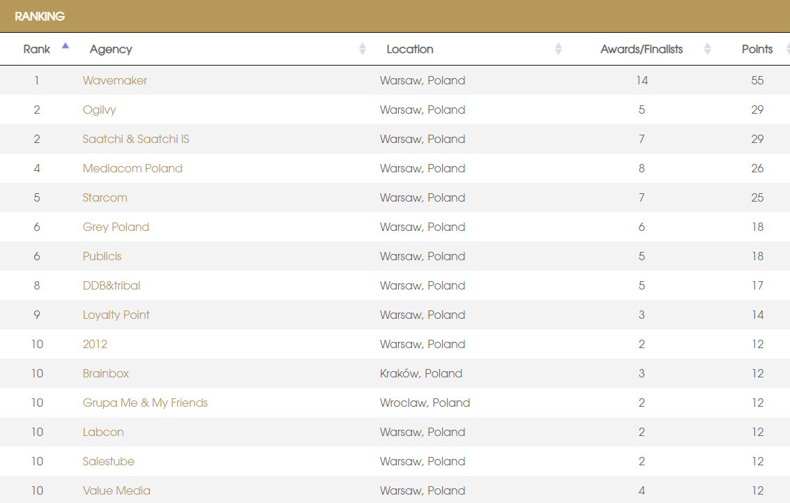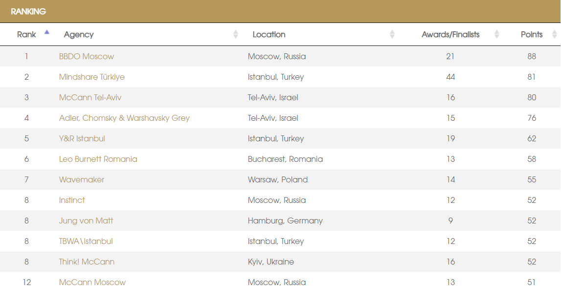Na pierwszym miejscu znalazł się rosyjski oddział agencji BBDO, tuż za nim Mindshare Türkiye, zaś na trzecim miejscu jest McCann Tel-Aviv. Co więcej, polska agencja Wavemaker zajęta w tym zestawieniu 7. miejsce.