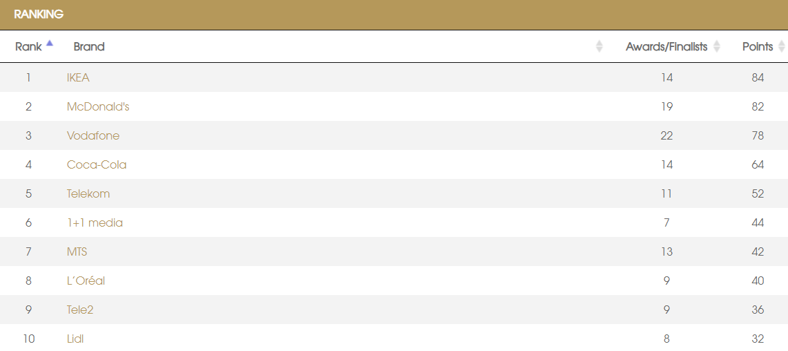 Zaszczytne pierwsze miejsce zajęła IKEA, drugie zaś McDonald’s. Na podium znalazła się też firma Vodafone. Tuż za nimi znajdują się odpowiednio Coca-Cola, Telekom, 1+1 media, MTS, L’Oreal, Tele2 oraz Lidl.
