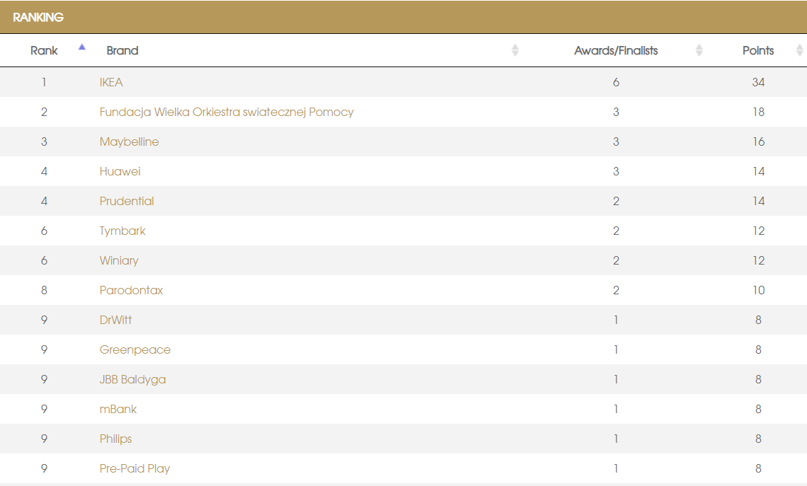 W przypadku Polski, tutaj IKEA również znalazła się na pierwszym miejscu. Tuż za nią WOŚP, zaś na trzeciej pozycji jest firma Maybelline. Czwarte miejsce zajmują firmy Huawei oraz Prudential. Następnie tuż za nimi są Tymbark, Winiary, Parodontax, DrWitt, Greenpeace, JBB Bałdyga, mBank, Philips oraz Pre-Paid Play.