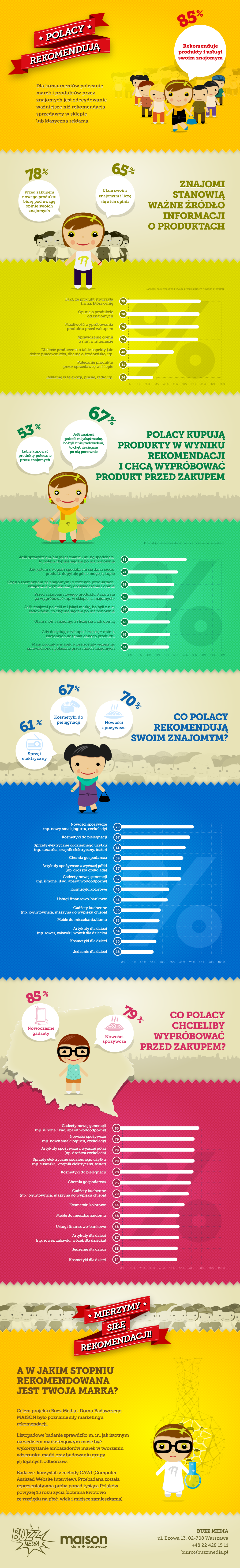 Zrealizowane przez agencję reklamowa BUZZ MEDIA we współpracy z DOMEM BADAWCZYM MAISON najnowsze badanie dotyczące marketingu rekomendacji wśród polskich konsumentów przynosi mnóstwo danych o tym, jakich rekomendacji słuchamy oraz co i komu sami skłonni jesteśmy polecać. Celem projektu było poznanie siły marketingu rekomendacji. Badanie sprawdziło m. in. jak istotnym narzędziem marketingowym może być wykorzystanie ambasadorów marek w tworzeniu wizerunku marki oraz budowaniu grupy jej lojalnych odbiorców.