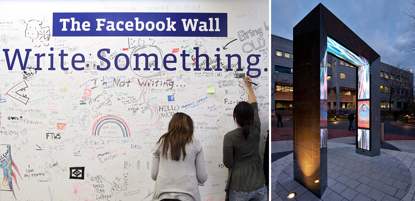 Po lewej: siedziba Facebooka w Kalifornii, po prawej: interaktywny portal w Northeastern University w Bostonie