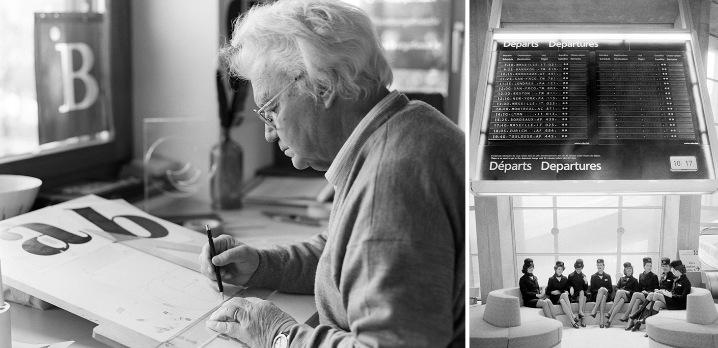 Po lewej: Adrian Frutiger podczas pracy, po prawej: projekt oznakowania lotniska im. Charlesa de Gaulle’a, 1974 r.