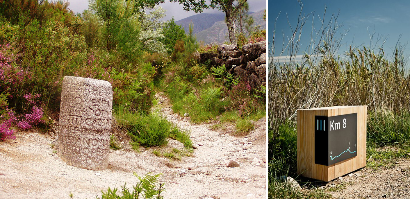 Po lewej: rzymski kamień milowy, po prawej: współczesna wersja oznakowania przy drodze
