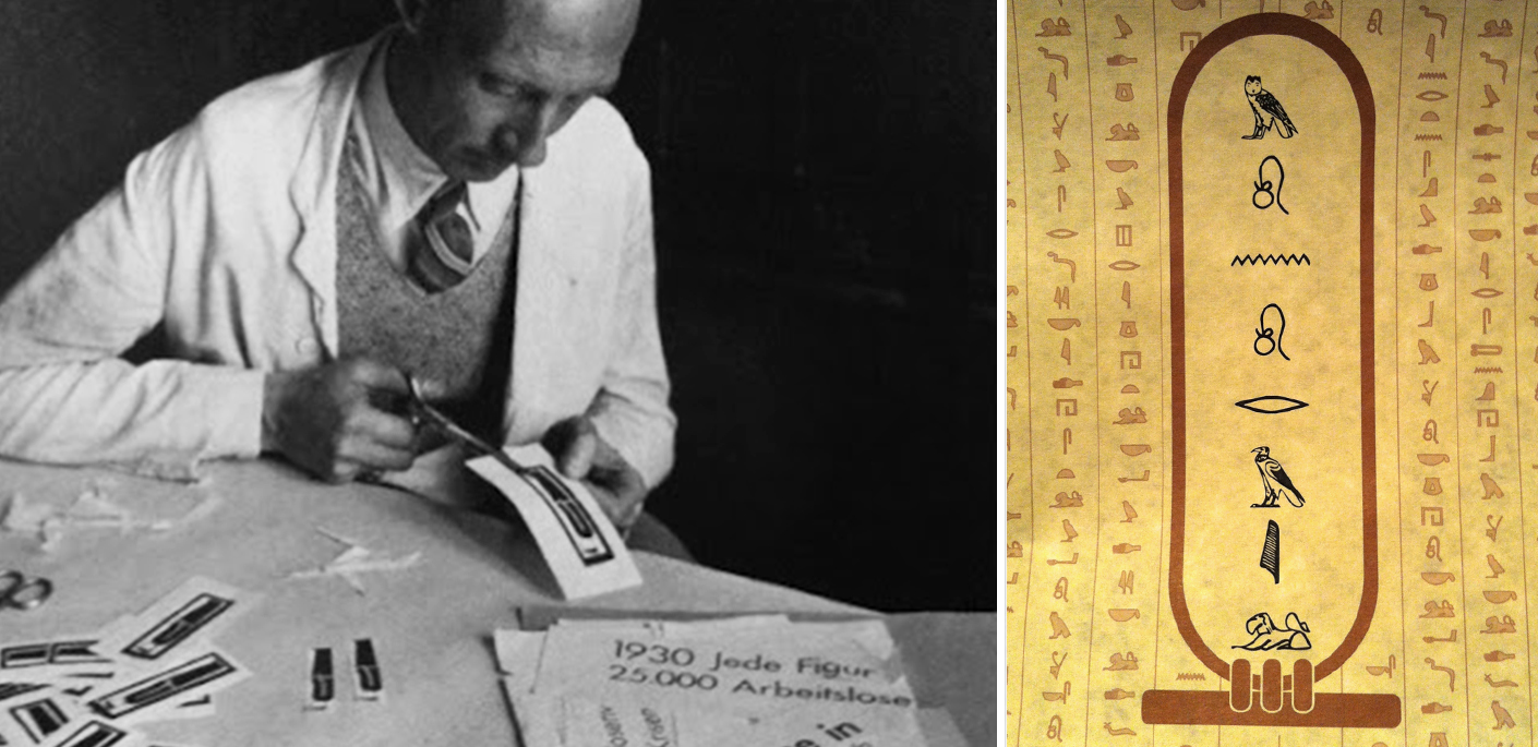 Po lewej: Otto Neurath podczas pracy, po prawej: egipski kartusz i hieroglify