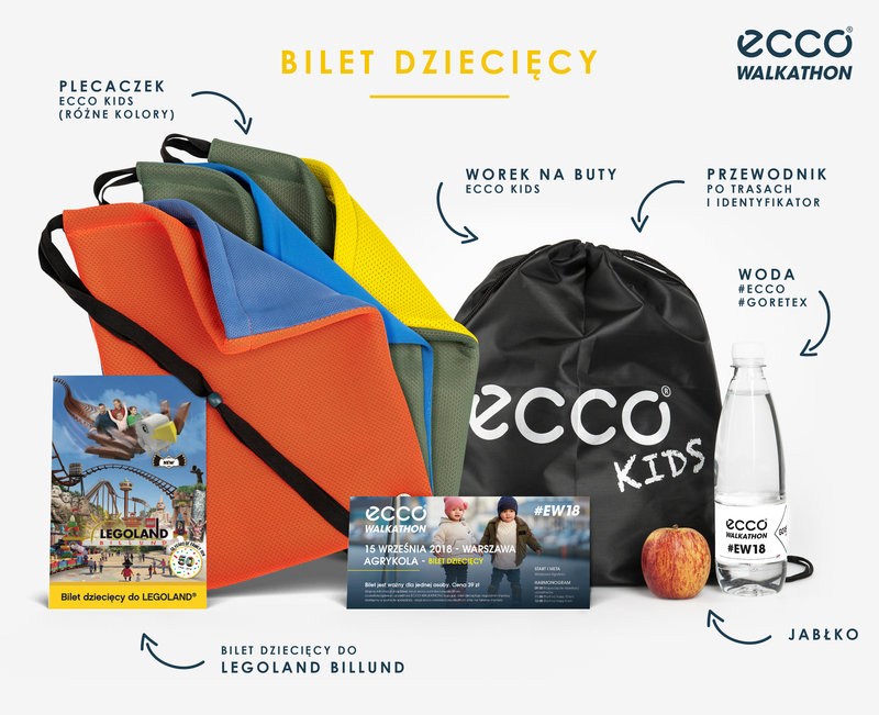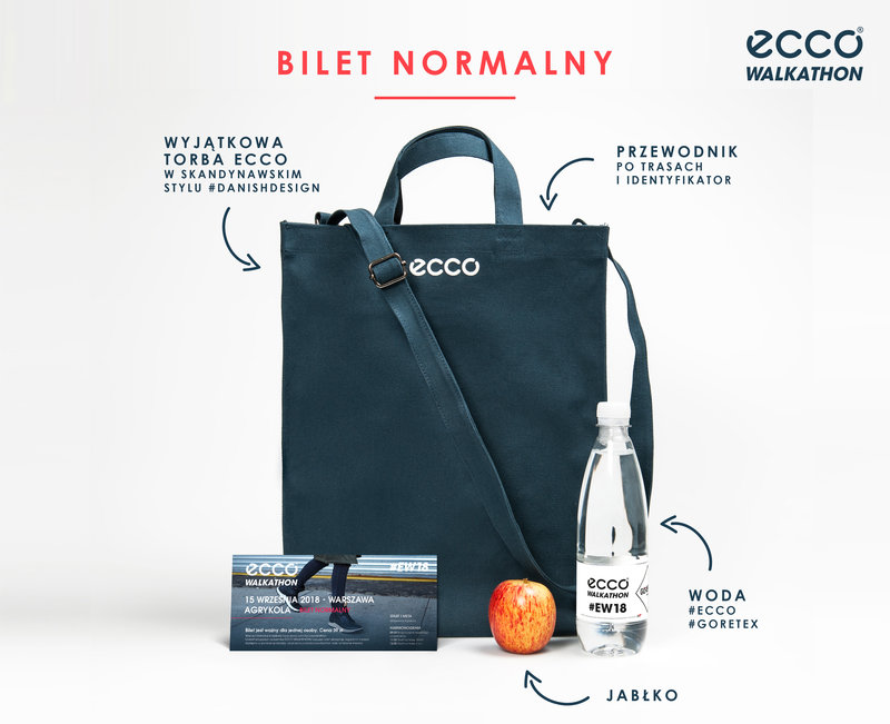 Ostatnie bilety na ECCO Walkathon są do nabycia na stronie ecco.com i w wybranych sklepach ECCO w Polsce w cenie 39 złotych. Na miejscu imprezy bilet wymieniany jest na pakiet startowy składający się z: materiałowej, modnej i praktycznej torby na ramię w stylu skandynawskim, butelki wody, jabłka i przewodnika po trasach oraz identyfikatora. W pakietach startowych dla dzieci poniżej 12 roku życia przygotowano w prezencie kolorowy plecaczek i worek na buty ECCO Kids oraz bilet dziecięcy dla jednej osoby do duńskiego parku rozrywki LEGOLAND w Billund.