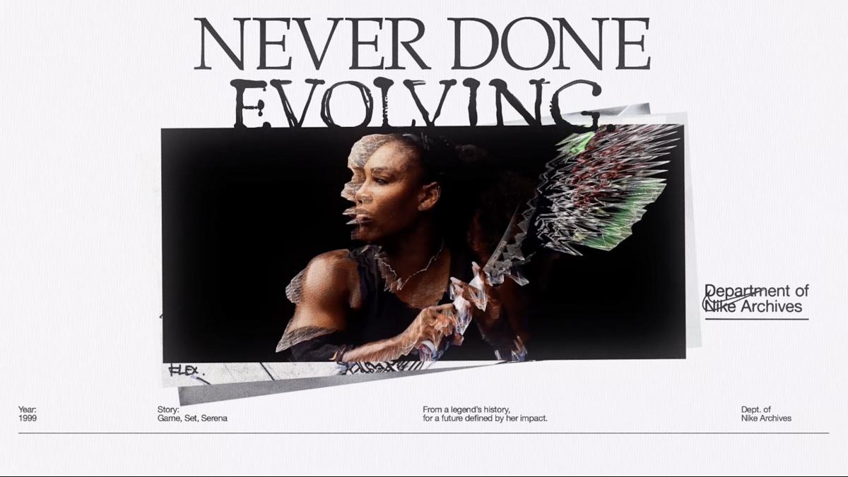 Nike świętowało karierę Sereny Williams za pomocą wirtualnego, tenisowego starcia z udziałem jej przeszłych (1999) i obecnych (2017) wersji. Zaawansowane AI przeanalizowało i odtworzyło ewoluujące style gry Sereny, dostarczając unikalny wgląd w analizy sportowe i wizualizację danych.