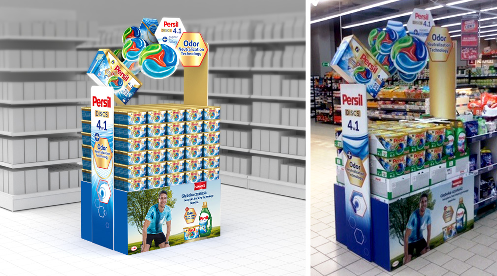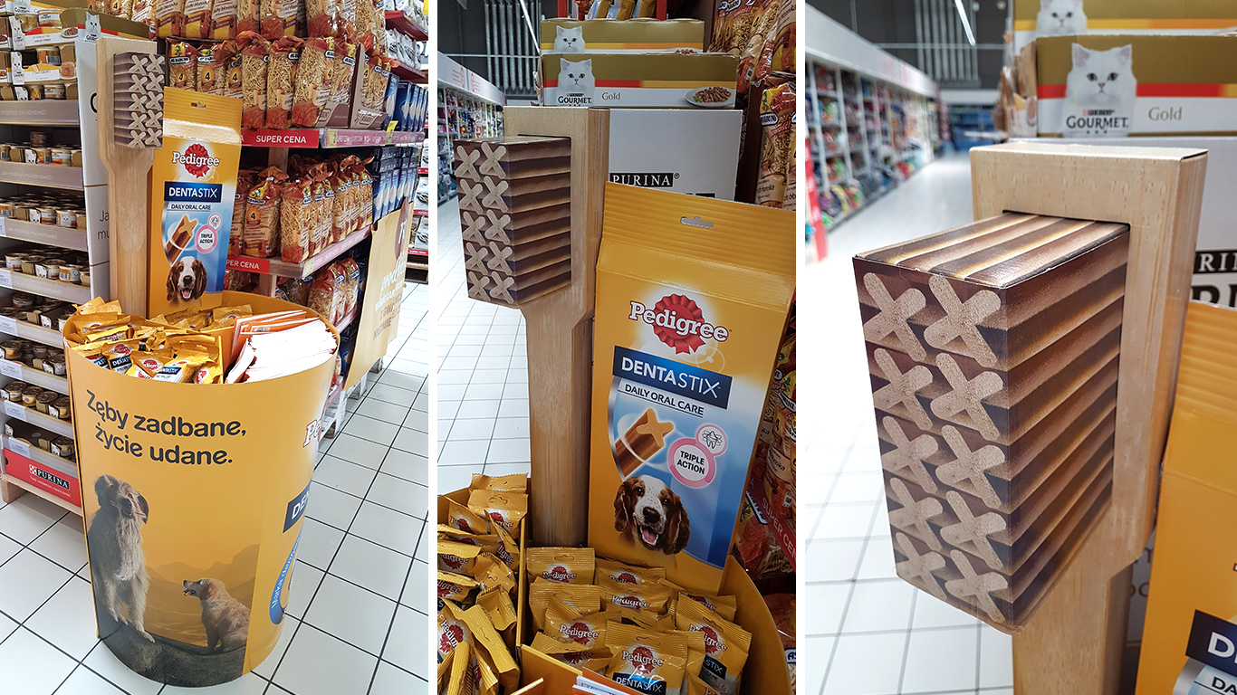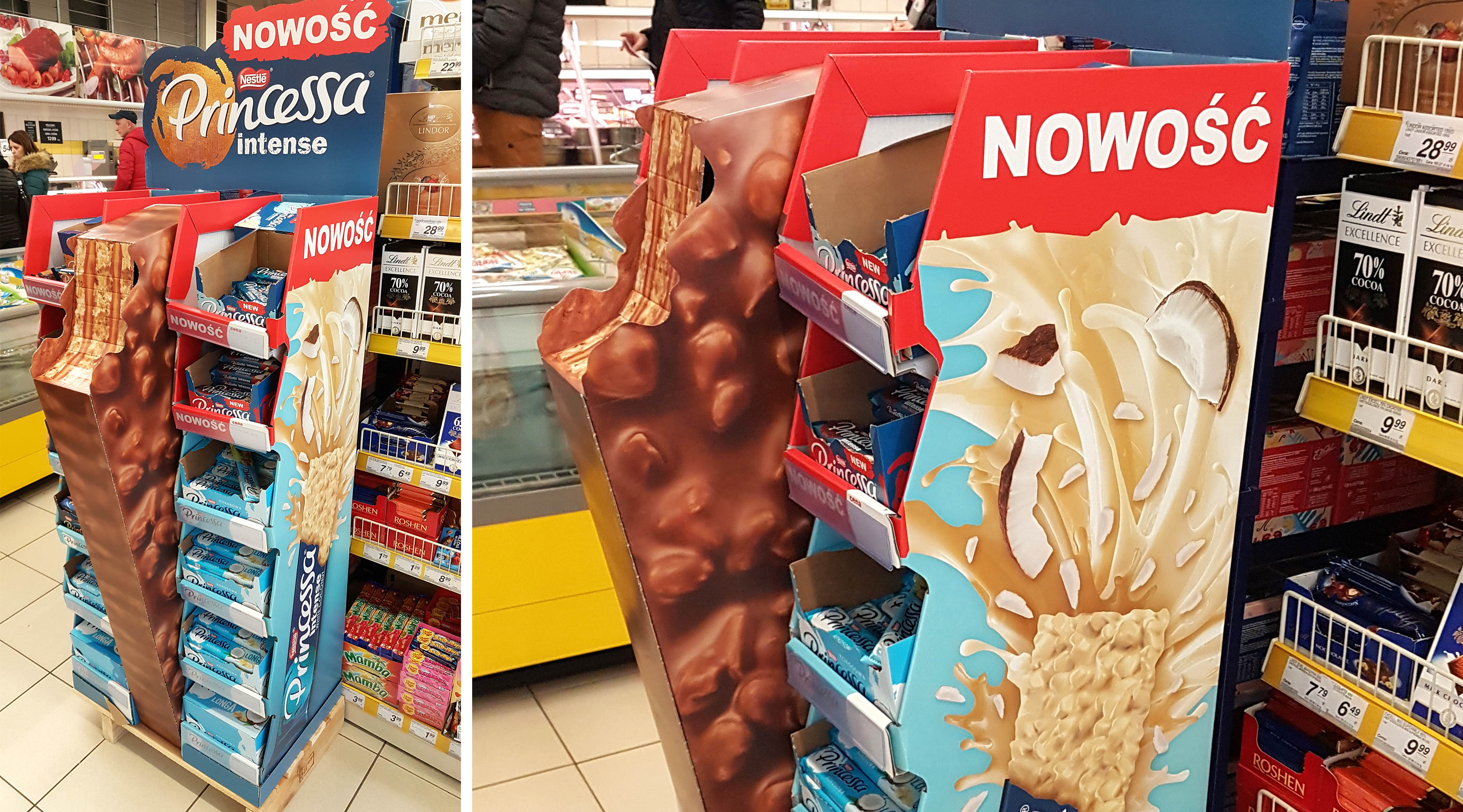 Dzięki świetnemu pomysłowi rozdzielenia dwóch modułów z półkami kartonowym wafelkiem projektanci otrzymali naprawdę duży packshot. „Appetizing” tego displaya jest przez to imponujący! No i dodatkowo świetny patent konstrukcyjny polegający na tym, że ten wafelek jest ruchomy i na czas transportu chowa się w obrysie paletki, co znacznie upraszcza logistykę.