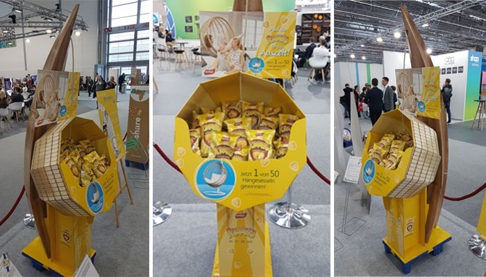 Nawiązując swoją konstrukcją do bujanego, ratanowego fotela w świetny sposób przyciągnął wzrok – również ludzi zwiedzających targi. Zwróćcie uwagę, że to nadal format ¼ palety! Co prawda jak na nasze, krajowe warunki bardzo wysokiej. A także, co jest powodem mojego nieustającego zdziwienia, wyjątkowo słabo zatowarowanej. Ale taką tendencję obserwuję w konstrukcjach niemieckich od dawna – przede wszystkim branding i image, w drugiej kolejności ilość face’ów i pojemność!