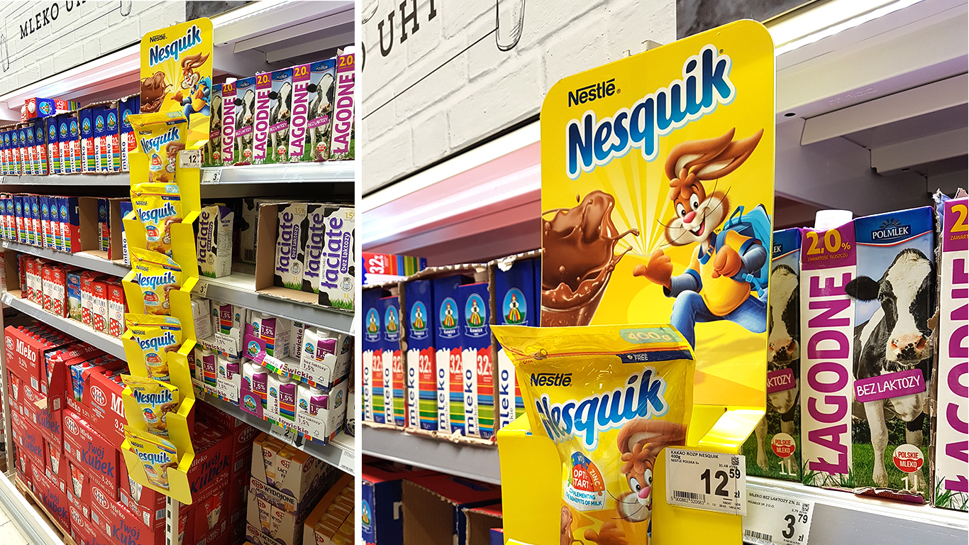Niektóre produkty są wręcz idealne do sprzedaży crossowych w kategoriach komplementarnych. Potrzebne jest tylko odpowiednie narzędzie ekspozycyjne. Nesquik doskonale to rozumie. I chociaż duże paczki mogą się wydawać niezgrabną oraz ciężką do powieszenia bryłą – to tutaj, na regale z mlekiem wpasowały się świetnie!