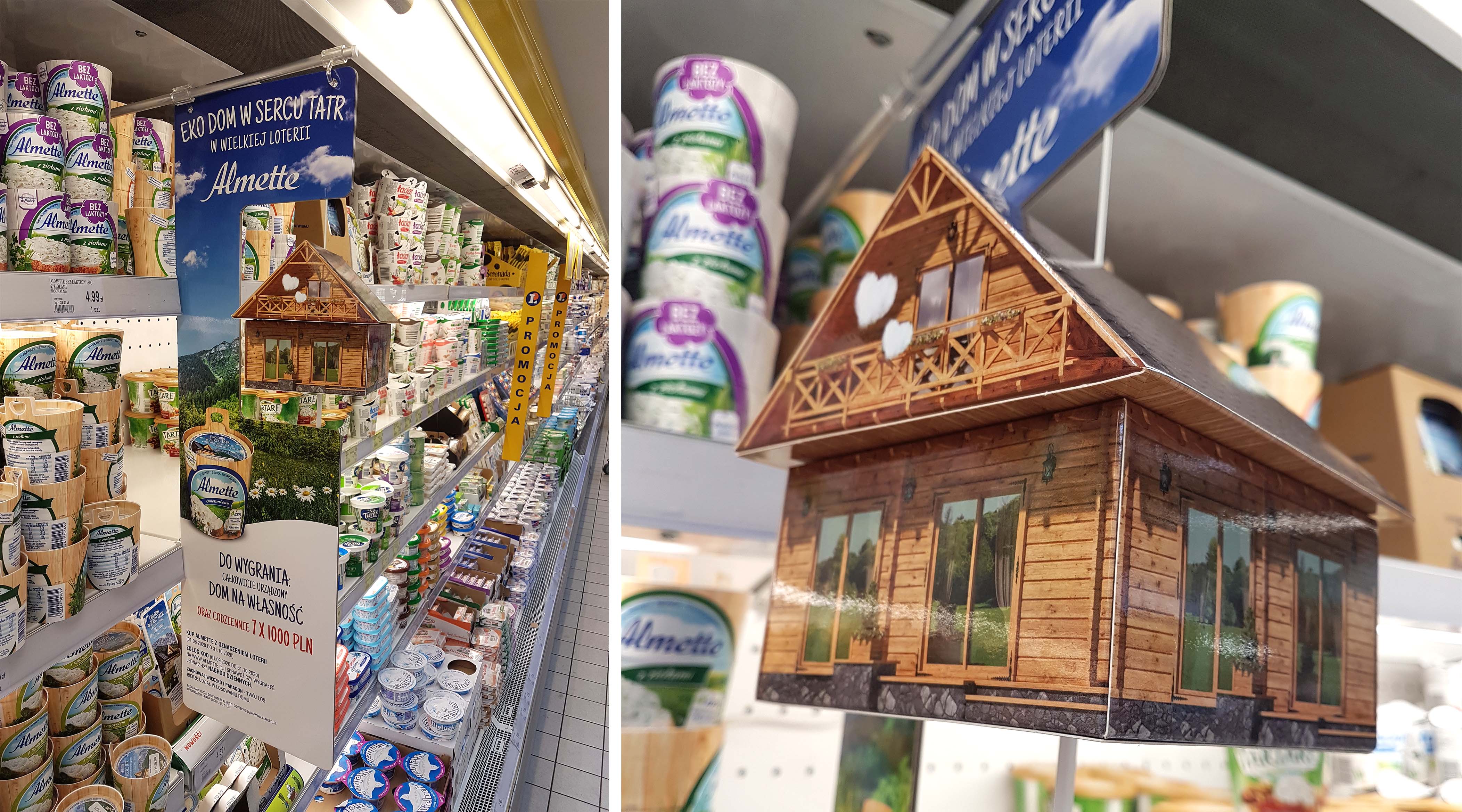 Flaga zwana też shelfstoperem z komunikacją loterii. Bryła domu drewnianego, który jest główną nagrodą, stanowi tutaj elementem obrotowy. Moim zdaniem to produkcyjny i konstrukcyjny majstersztyk! Doświadczony producent potrafi, jak widać, z kartonu zrobić cuda.