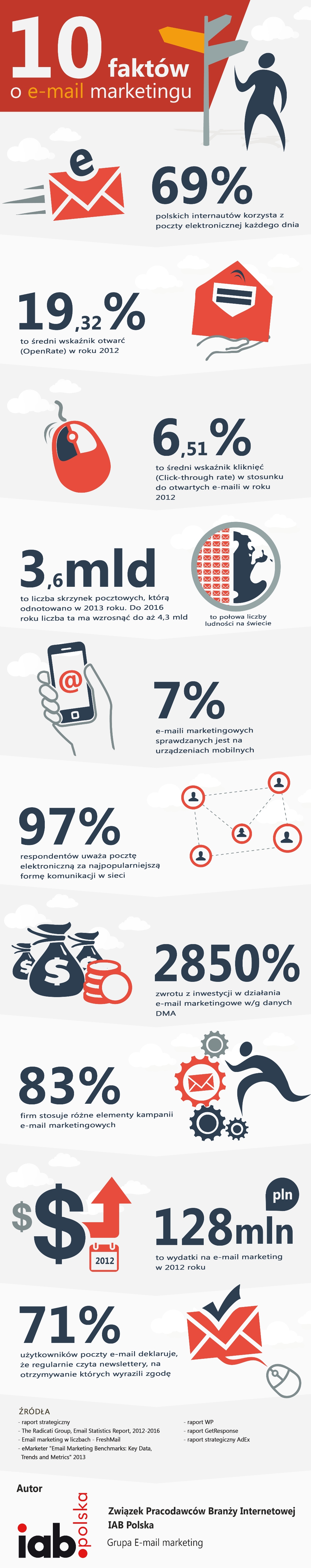 – Koniec roku to zawsze czas podsumowań i planów, których realizację rozpoczniemy zaraz po sylwestrze. Z myślą o marketerach grupa robocza ds. email marketingu IAB Polska przygotowała infografikę, która obrazuje 10 najważniejszych faktów związanych z komunikacją e-mailową. Po zapoznaniu się z nią marketer będzie przekonany, że e-mail markeitng w wielu przypadkach może być wciąż najbardziej efektywnym kanałem komunikacji marketingowej i nie powinno go zabraknąć w marketing mixie w 2014 roku. Owocnej lektury 🙂 – powiedział Paweł Sala, szef Grupy Roboczej Email Marketing IAB Polska.