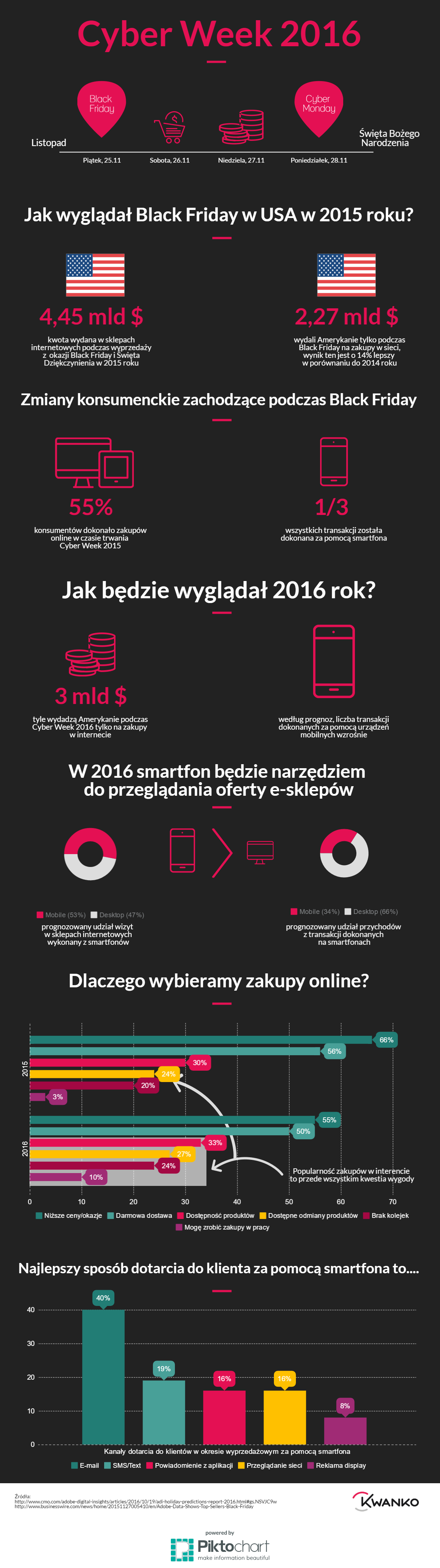 Wraz z liczbami zmieniają się też zachowania konsumentów. Z roku na rok liczba użytkowników, którzy kupują za pomocą urządzeń mobilnych rośnie. W zeszłym roku aż 55 proc. zakupów było dokonywanych online, a 1/3 z nich – za pomocą smartfona. Prognozuje się, że podczas tegorocznego Cyber Week sprzedaż w Ameryce osiągnie aż 3 mld dolarów, a liczba zakupów zrobiona na telefonach komórkowych będzie wyższa niż tych zrealizowanych na urządzeniach stacjonarnych.