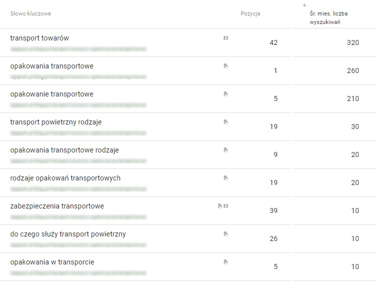 Powyżej zobaczyć można przykład jednego z artykułów na blogu na temat opakowań transportowych, który analizowany jest w narzędziu Senuto. Pokazane są frazy, na jakie widoczny jest artykuł, a także ich pozycja i popularność. Jest to tylko fragment listy fraz kluczowych, ale zauważyć można, że część przypisanych do treści fraz pokazuje się w top 10 wyników wyszukiwań, a część jest poza top 10 czy top 20. Analiza ta daje nam możliwość zastanowienia się, w jaki sposób możemy dodatkowo zoptymalizować artykuł, aby z jednej strony frazy, które są już w pierwszej 10, wzrosły np. do top 5, a z drugiej strony zaplanować prace w celu wzmocnienia widoczności fraz spoza top 10, na przykład będących w top 20, czyli potencjalnie najbliżej, aby pojawić się na pierwszej stronie Google.