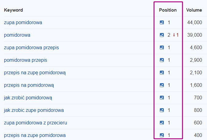 Przykładowo, w narzędziu ahrefs.com przeanalizowany został jeden z blogów kulinarnych i wpis na temat zupy pomidorowej. Zobaczyć można, że ma bardzo wysokie pozycje na frazy ogólne, a przy tym popularne, jak „zupa pomidorowa” czy „pomidorowa przepis”, ale również na frazy bardziej doprecyzowane, np. „jak zrobić zupę pomidorową”. Obok pokazana jest także popularność danej frazy kluczowej.