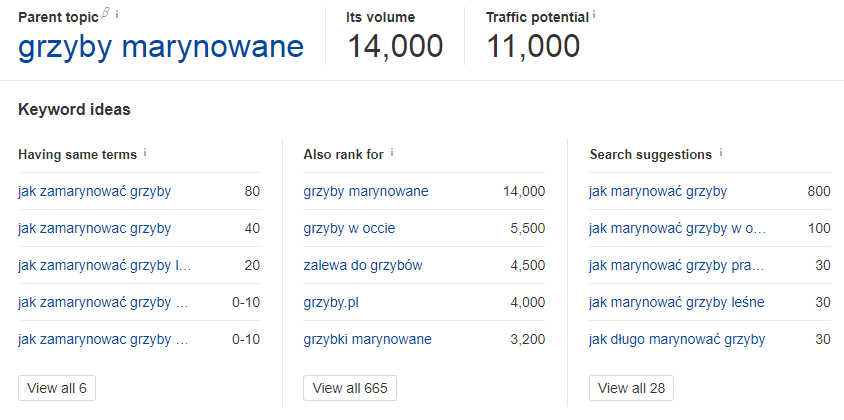 Kolejną możliwością, którą z przedstawionych w artykule narzędzi daje jedynie Ahrefs, jest analiza przypisanej do danego artykułu frazy kluczowej pod kątem podobnych wyszukiwań. W Ahrefsie znajduje się funkcja „Keywords Explorer”, dzięki której po wpisaniu danego słowa pojawiają się propozycje podobnych fraz. Przykładem jest fraza „grzyby marynowane”, po wpisaniu której pojawia się lista proponowanych, podobnych albo bardziej dookreślonych fraz, jakie można wykorzystać przy pisaniu artykułu.