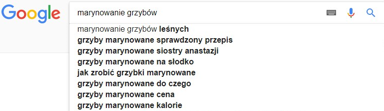 W rezultacie dostajemy listę fraz typu „jak zamarynować grzyby” albo bardziej dookreślonych, np. „jak zamarynować grzyby w occie”. W prawej kolumnie „Search suggestions” pojawia się lista zapytań, które powiązane zostały z wyszukiwaną frazą. Taka lista zainspirować nas może do rozwoju stworzonej już treści, jeśli na przykład są frazy, których nie wykorzystaliśmy w tekście. Przykładowo, można stworzyć dodatkowy akapit z wykorzystaniem danej frazy kluczowej albo zastanowić się nad stworzeniem nowego tekstu z wykorzystaniem innych – zbliżonych fraz.