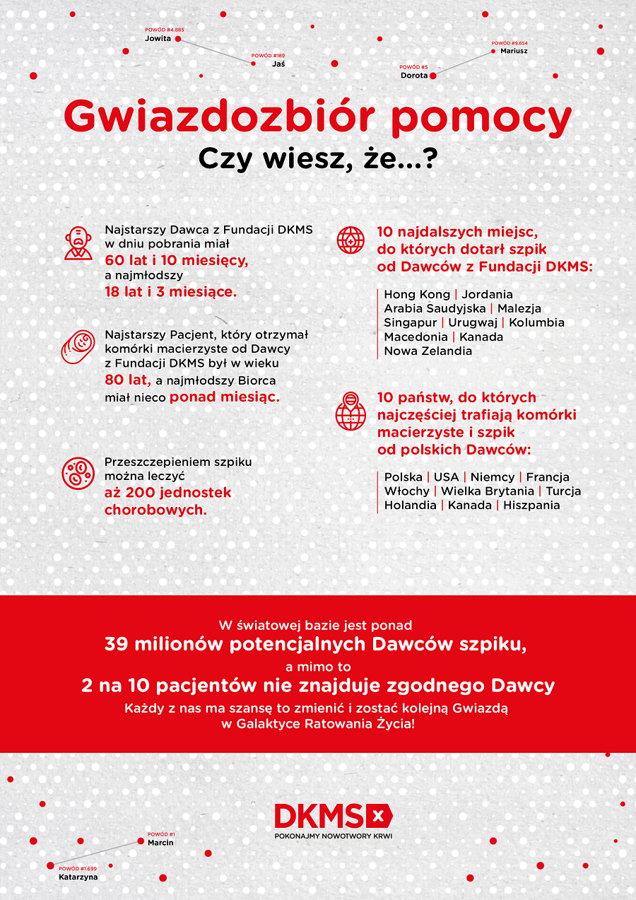 Początek 2022 roku to dla Fundacji DKMS szczególny czas. Czas, w którym może z dumą ogłosić, że już 10 tysięcy faktycznych Dawców szpiku podarowało szansę na życie drugiemu człowiekowi, czekającemu na przeszczepienie szpiku. Na tę liczbę składa się również praca wielu zaangażowanych instytucji czy Wolontariuszy. Ta Galaktyka Ludzi Dobrej Woli, która z dobroci serca, bezinteresownie pomogła chorym, zasługuje, by powiedzieć o niej nieco więcej. Z tej okazji, Fundacja zebrała najbardziej interesujące dane w kontekście szlachetnego czynu, jakim jest dawstwo szpiku, by dalej szerzyć dobro i zachęcać do niego innych.