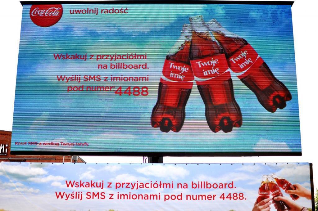 „Podziel się radością” to sztandarowa polska akcja z wykorzystaniem Short Code. Najpierw w centrum Warszawy, a następnie w innych dużych miastach Polski ustawiono billboard. Wyświetlany obraz zapraszał do wysyłania za pomocą SMS imion przyjaciół pod podany numer. Przesłane dane wyświetlały się na cyfrowych butelkach reklamowanego napoju. Krótki filmik z eventu można zobaczyć poniżej: