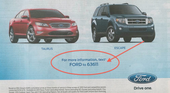 Ford w celu osiągnięcia wysokiej jakości leadów dla nowych modeli Taurus i Escape, kampanię reklamową uzupełnił o billboardy z podanym numerem Short Code, pod którym zainteresowani mogli otrzymać więcej informacji.