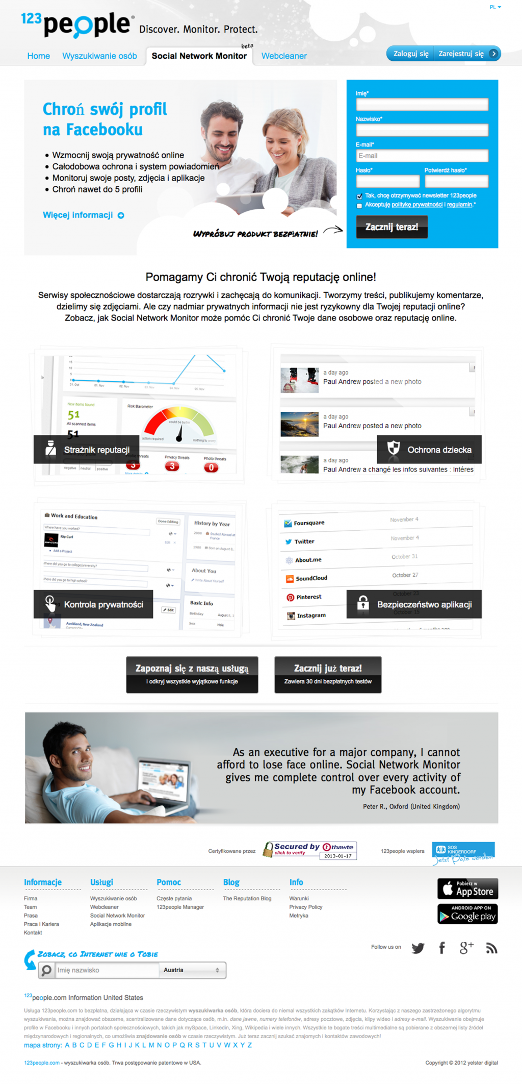 Na przestrzeni ostatnich lat powstała w Austrii wyszukiwarka osób, 123people, co raz bardziej ewoluowała w kierunku narzędzia do zarządzania danymi osobowymi w Internecie. – Mimo, iż wiele osób nadal jest zaskoczonych tym, co mogą znaleźć na swój temat w sieci, wyszukiwanie informacji związanych z imieniem i nazwiskiem to tylko pierwszy krok w dbaniu o ochronę swojej reputacji online – tłumaczy Alexandra Senoner, Dyrektor Komunikacji i Public Affairs 123people. – Ponad 77% polskich użytkowników Internetu robi to regularnie – dodaje. Usuwanie osobistych informacji z sieci, które można znaleźć na 123people, jest przeprowadzane przez międzynarodowy zespół osób zajmujących się obsługą klienta i jest bezpłatne.