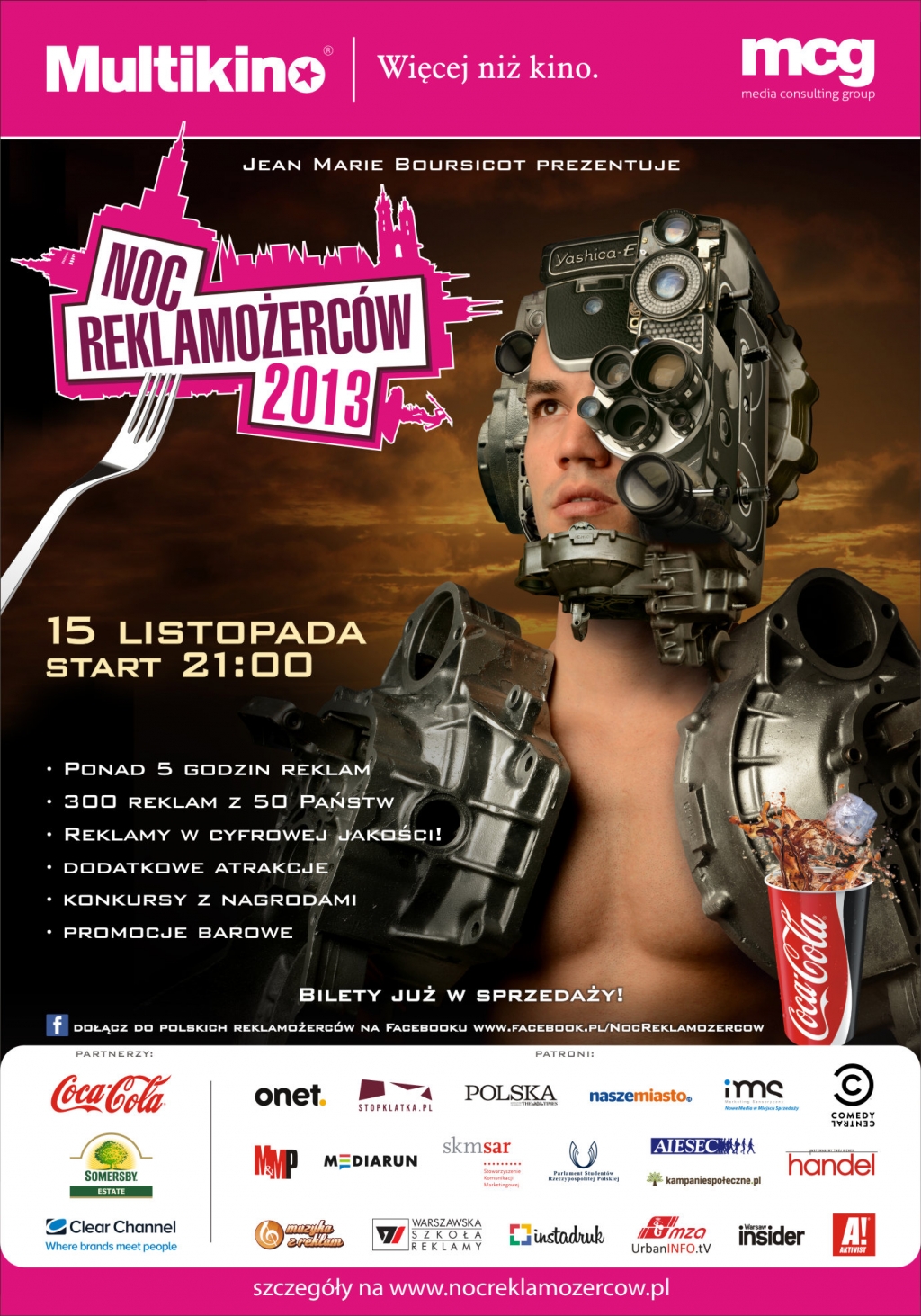 Noc Reklamożerców to unikalna w skali całego świata impreza filmowa, złożona z projekcji starannie wyselekcjonowanych reklam. Obok festiwalu w Cannes to największe międzynarodowe święto reklamy organizowane od ponad 30 lat, w 40 krajach. W tym roku w Polsce Noc Reklamożerców odbędzie się po raz 22, a w kinach sieci Multikino po raz 11! Co ważne tym razem po raz pierwszy dla polskich Reklamożerców program zostanie wyemitowany nie jak dotychczas z DVD lecz z cyfrowych plików (DCP) z wykorzystaniem nowoczesnych, kinowych projektorów cyfrowych!
