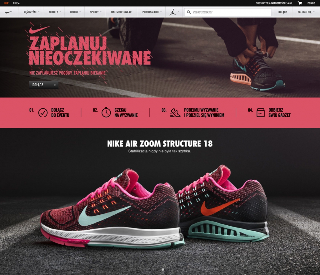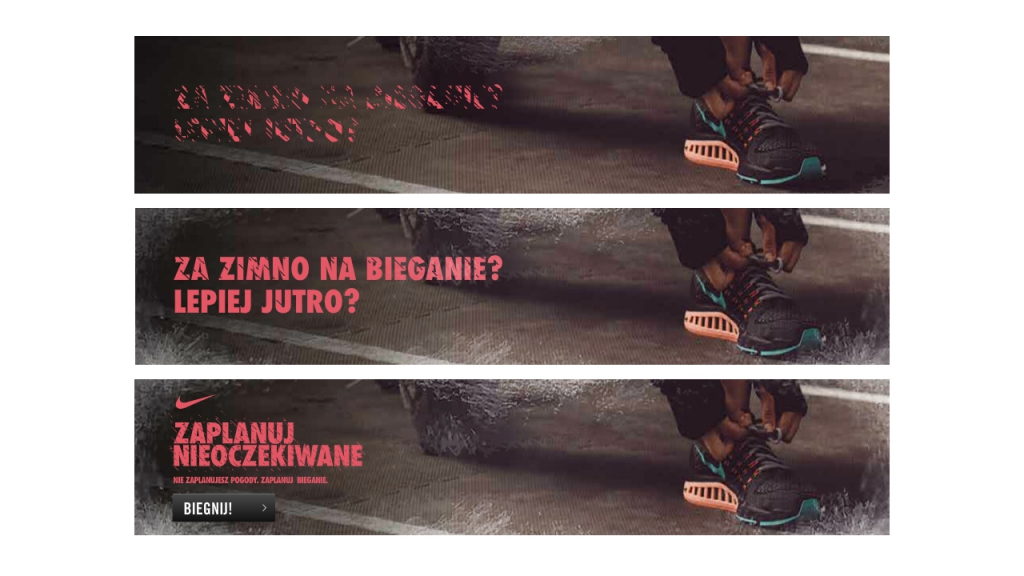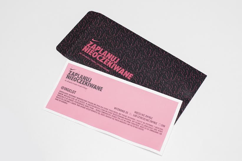Nie można zaplanować pogody, ale można zaplanować bieganie. To idea towarzysząca aktywacji stworzonej przez 180 dla NIKE. Przez kilka tygodni biegacze byli zachęcani do ignorowania warunków atmosferycznych i podejmowania kolejnych sportowych zmagań. Każdy, kto dołączył do wydarzenia Zaplanuj nieoczekiwane, otrzymał pięć powiadomień – zaskakujących biegowych wyzwań. Gdy pogoda się psuła, uczestnik otrzymywał wyzwanie do zrealizowania właśnie tego dnia, z jak najkrótszym czasem reakcji. Nieoczekiwany plan wymagał np. pobicia któregokolwiek dotychczasowego rekordu, przebiegnięcia 5km w nocy, czy biegu w jak najkrótszym czasie od otrzymania powiadomienia. Biegacze, którzy najlepiej poradzili sobie z zadaniami, zostali nagrodzeni produktami Nike.