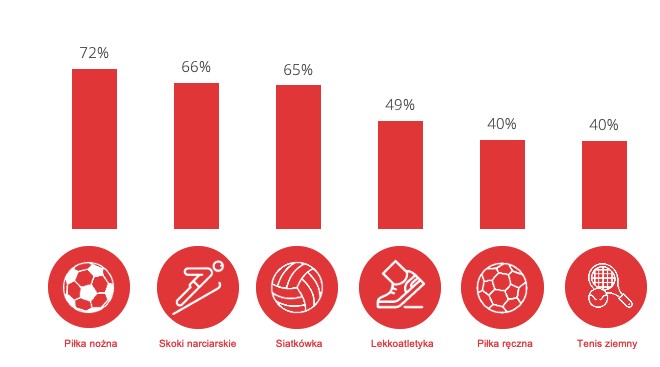 Sportem interesuje się 89% Polaków, są to zarówno kobiety (49%) jak i mężczyźni (51%). Najpopularniejszymi dyscyplinami są niezmiennie piłka nożna, skoki narciarskie oraz siatkówka. Warto zauważyć, że w tym roku tenis ziemny znalazł się w pierwszej piątce najpopularniejszych dyscyplin uzyskując taki sam wynik jak piłka ręczna.