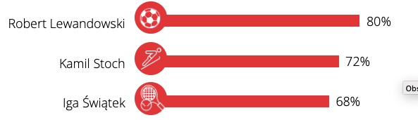 Również w rankingu najbardziej znanych sportowców po raz pierwszy na podium znalazła się Iga Świątek, uzyskując trzecia pozycję, zaraz po Robercie Lewandowskim i Kamilu Stochu. Warto podkreślić, że jeszcze rok temu ze znajomością wspomaganą sięgającą 50% była na ósmej pozycji. W ciągu dwóch lat znajomość Igi Świątek wzrosła ponad dwukrotnie (z 33% w 2020 roku do 68% w 2022 roku).