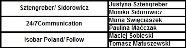 Przewodniczącą kategorii była Małgorzata Leniarska/ Dragon Rouge. Brief napisał Bartłomiej Brach/ One Eleven.