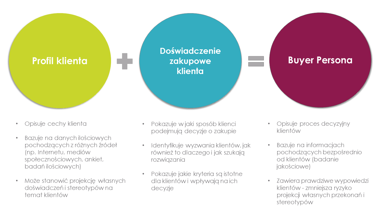Kolejną trudnością jest dobór takich danych, które rzeczywiście mogą pomóc w zrozumieniu klientów biznesowych i ich sposobu postępowania podczas podróży zakupowej. Tutaj potrzebne jest wyjaśnienie. Często pojęcie profil idealnego klienta używane jest wymiennie z buyer personą. Są to jednak dwa różne narzędzia. Zarówno profil klienta, jak i persona zakupowa służą do tego, by poznać swoją grupę docelową. Natomiast sposób ich budowania zasadniczo się od siebie różni.