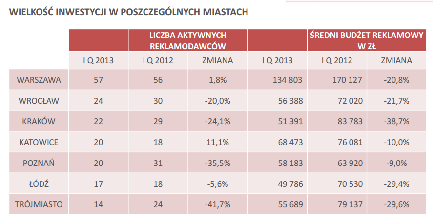 Na spadki złożyło się zmniejszenie liczby firm korzystających z reklamy wielkoformatowej o 17,2 proc. ze 134 w IQ 2012 na 111 w IQ 2013 oraz obniżenie średniego budżetu przeznaczonego na nośnik wielkoformatowy o 17 proc. z 51 852 zł na 43 039 zł.