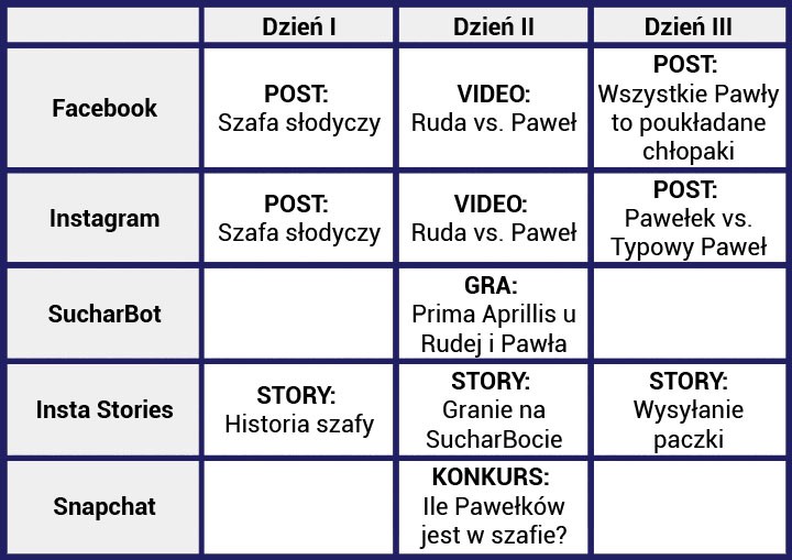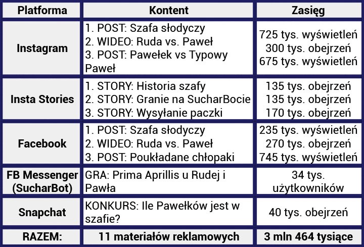 Ogółem stworzyliśmy 11 materiałów reklamowych: grafiki, wideo i zdjęcia z Pawełkiem na Snapchacie, Instagram Stories, Instagramie oraz Facebooku.