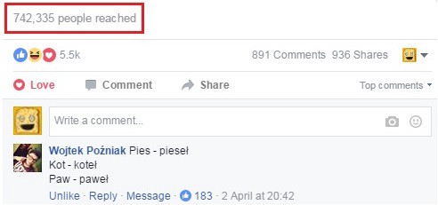 - został udostępniony 930 razy i 890 razy skomentowany (głównie przez osoby o imieniu Paweł i ich znajomych ;).