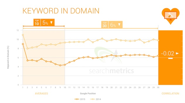 Coraz więcej stron z topów SERP nie używa słów kluczowych w body i description. Spada także popularność takich praktyk w doborze domen – SearchMetrics stwierdził je tylko w 6 proc. badanych stron.