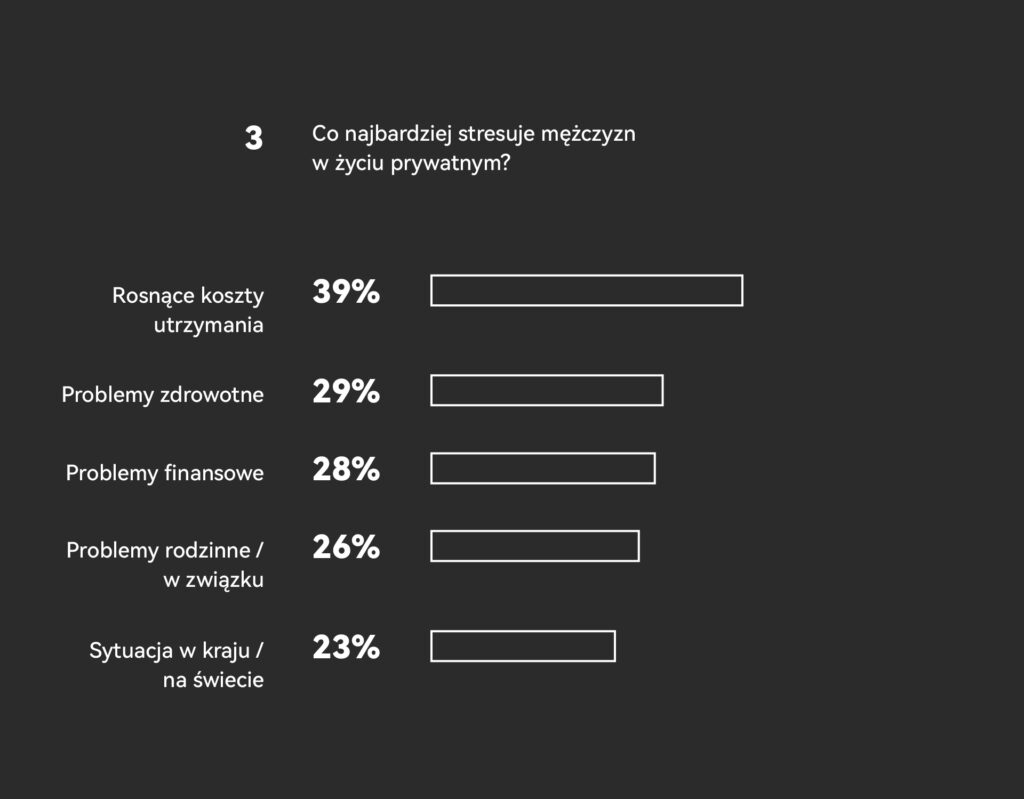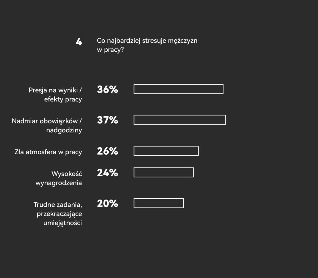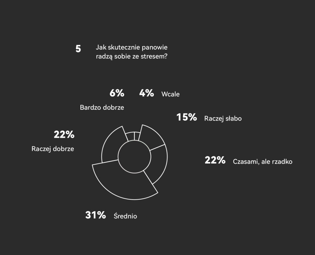 Autorzy badania przeanalizowali również kwestie związane z umiejętnością radzenia sobie ze stresem. Niestety wyniki tej części publikacji także nie wyglądają najlepiej. Aż 41% pytanych mężczyzn oceniło, że radzi sobie ze stresem gorzej, niż średnio. Co to oznacza w praktyce? Jeśli dodać do tego, że w Polsce o męskim zdrowiu psychicznym wciąż mówi się naprawdę niewiele, to niejednokrotnie wynikiem przewlekłego stresu okazują się stany depresyjne, postępująca izolacja i brak przestrzeni do podzielenia się odczuciami.