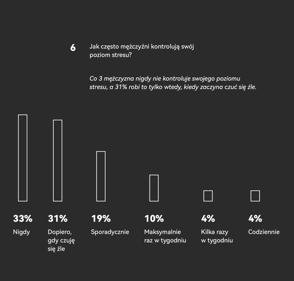 Jednocześnie zaledwie 4% Polaków korzysta z doraźnego kontaktu z psychologiem lub trenerem, a jedynie 6% regularnie praktykuje techniki relaksacyjne, takie jak ćwiczenia oddechowe, joga czy medytacja. To jeszcze nie koniec: co trzeci mężczyzna (33%) nigdy nie kontroluje swojego poziomu stresu, a 31% robi to tylko wtedy, kiedy zaczyna czuć się źle.