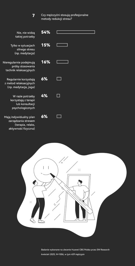 Niestety, wyniki badania Huawei CBG Polska nie są aż tak jednoznacznie pozytywne. Okazuje się bowiem, że aż 54% mężczyzn nie stosuje żadnych profesjonalnych metod redukcji stresu. Wśród najczęściej udzielanych odpowiedzi na pytanie o to, dlaczego, znalazło się stwierdzenie: nie odczuwam takiej potrzeby.