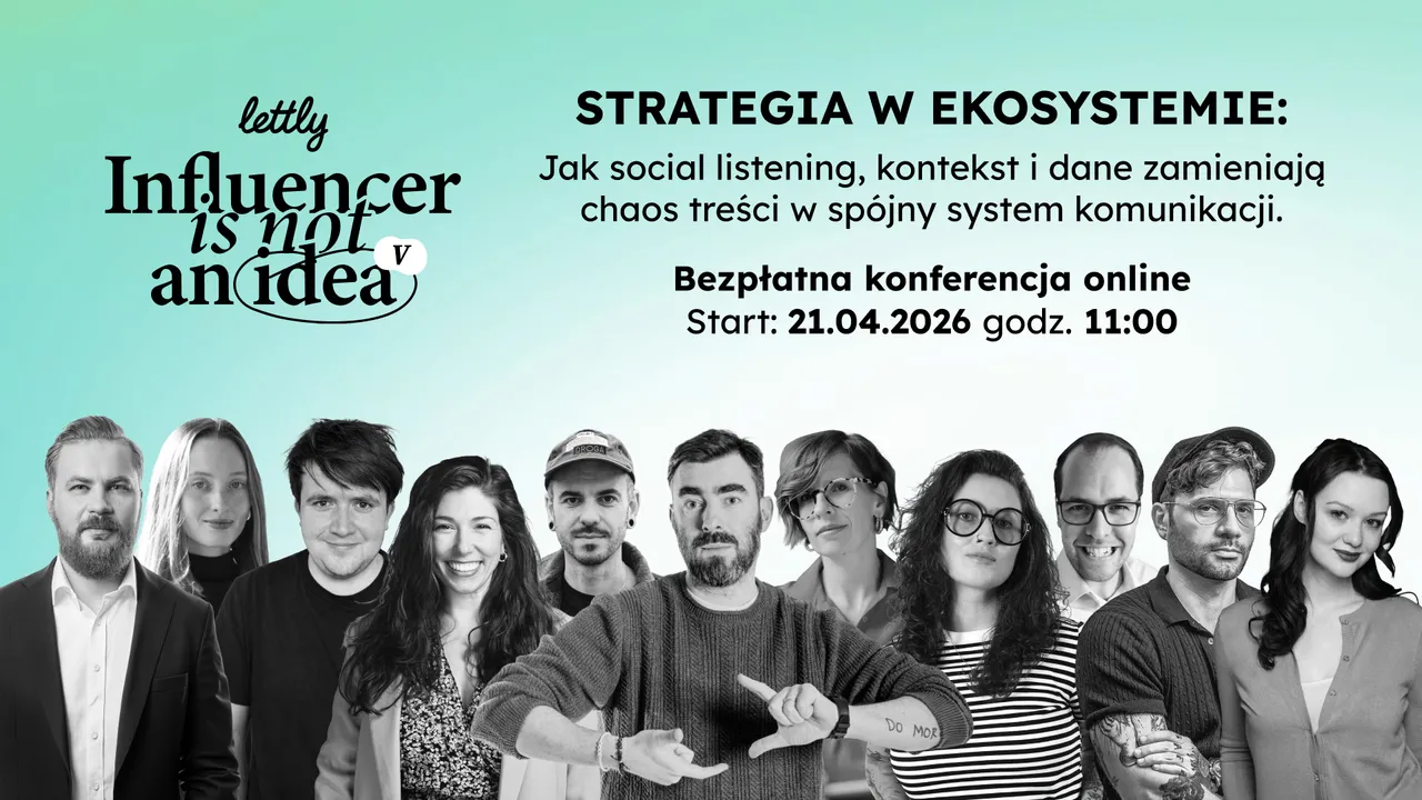 Konferencję organizuje Lettly – agencja strategiczna influencer marketingu, która od ponad dekady pomaga markom tworzyć kampanie przynoszące wymierne efekty. Influencer Is Not An Idea nie tylko konferencja, to filozofia Lettly. Bo influencer marketing to przemyślana strategia, zaufanie i świadome partnerstwo. Lettly realizuje projekty dla takich firm jak adidas, Danone, Wedel, Żywiec Zdrój, Unilever czy i Rak’n’Roll.