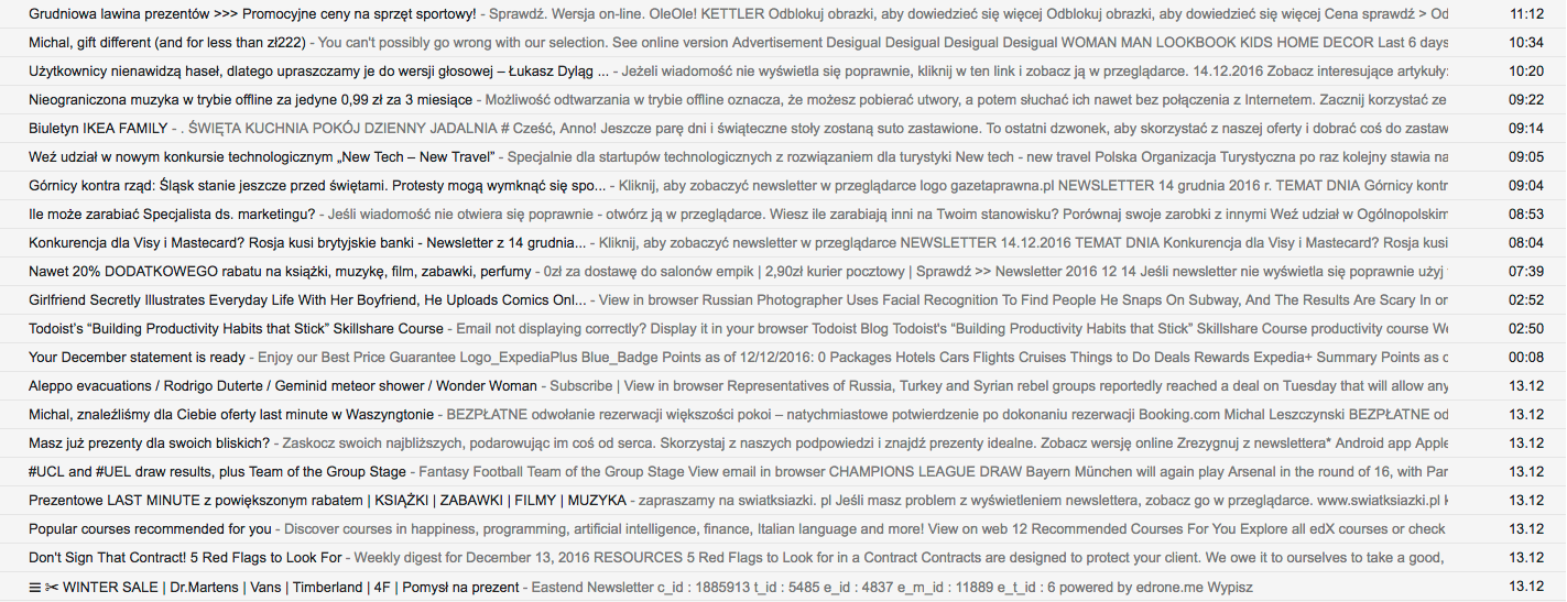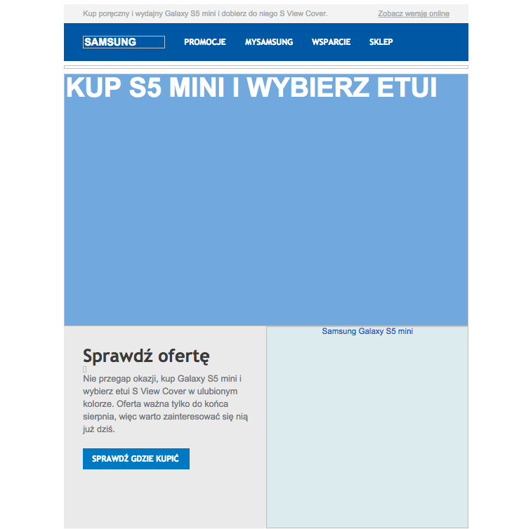 Warto tutaj również wspomnieć, że wspomniany preheader (tj. pierwsze zdanie wiadomości, znajdujące się powyżej headera, treści i wezwania do działania) oprócz możliwości zobaczenia wersji online emaila, ma wpływ na to, czy ów newsletter zostanie w ogóle otwarty. Jest on bowiem jednym z pierwszych elementów widocznych w skrzynce pocztowej klienta, zaraz obok tematu wiadomości.