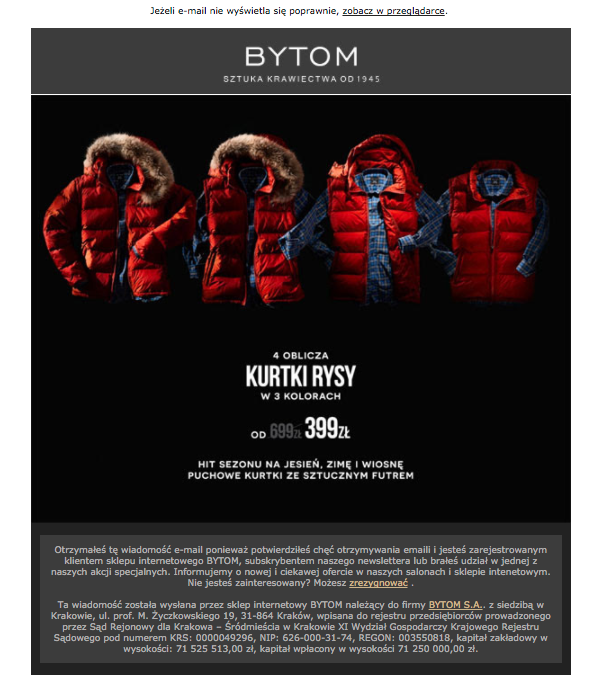 Newsletter marki Bytom, który zawiera zarówno preheader, jak i stopkę informującą odbiorcę o tym, dlaczego otrzymuje daną wiadomość.
